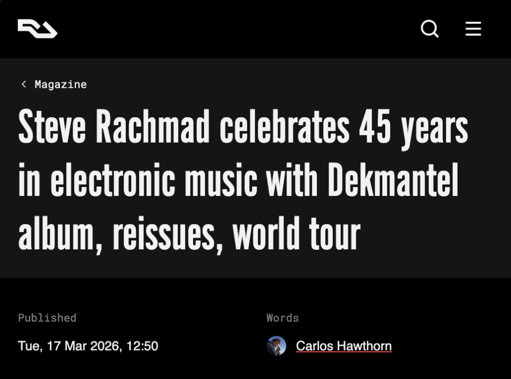 Resident Advisor has highlighted Steve Rachmad’s 45-year celebration in electronic music, covering his upcoming Dekmantel album, reissues, and world tour. The feature underscores Steve’s enduring influence and the landmark releases and performances planned for 2026.